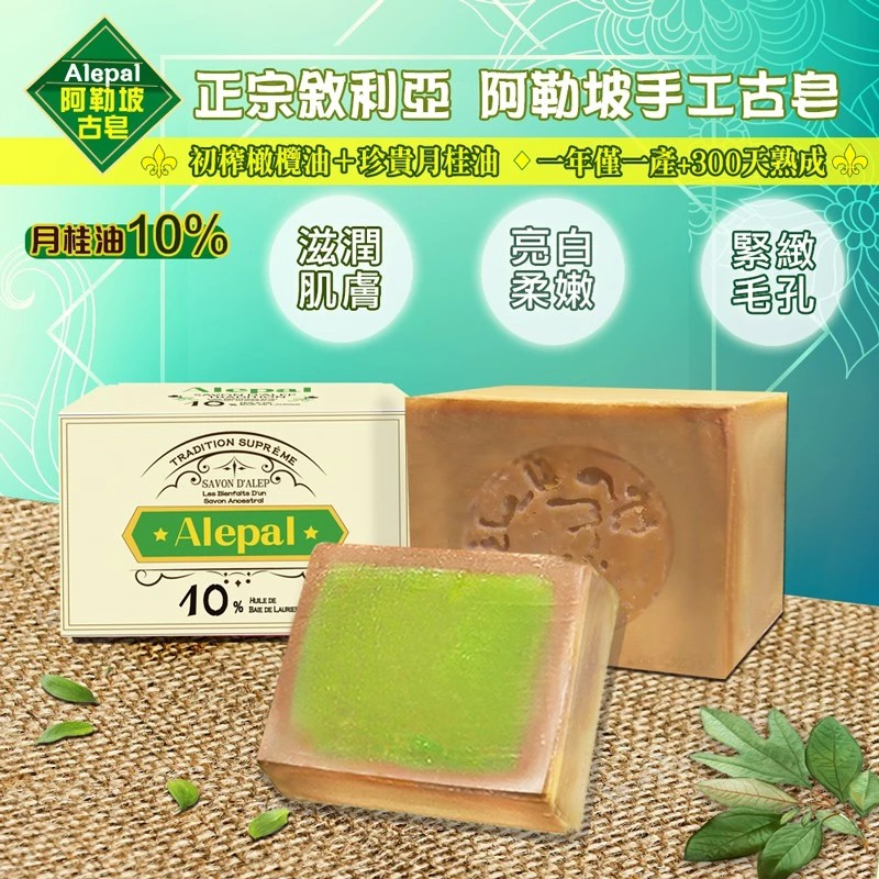 如果你是一位「問題肌膚」或是「背痘困擾者」,希望能有一塊能「調理膚質」的「古老神皂」,那Alepal這款「阿勒坡古皂」絕對是妳的救星。它最大的特色就在於使用了傳承千年的「古法」製作,並添加了珍貴的「月桂油」!月桂油具有強大的「抗菌」與「舒緩」效果,對於痘痘、濕疹等問題肌膚有很好的改善作用。妳可以依照膚質選擇10%(一般肌)或40%(油痘肌)的濃度。