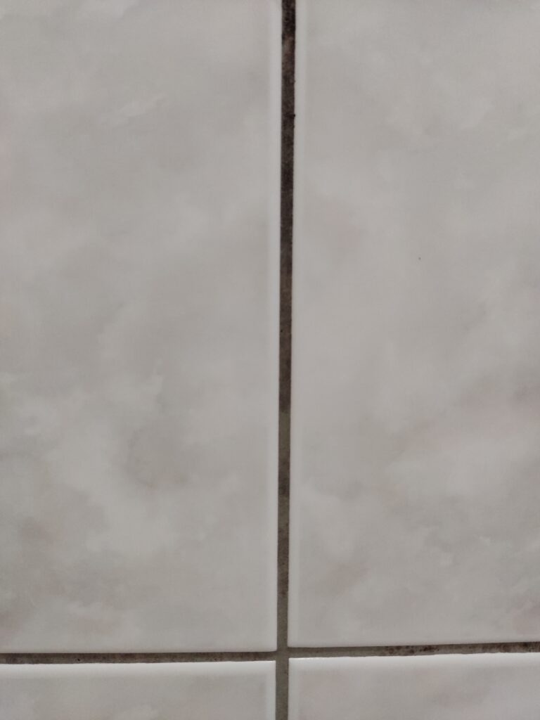 那些殘存的淡淡痕跡,隨著水流完全消失,磁磚縫瞬間恢復到剛裝潢好的那種潔白!完全沒費力刷洗,就是「噴、等、沖」三個步驟,戰爭就結束了!